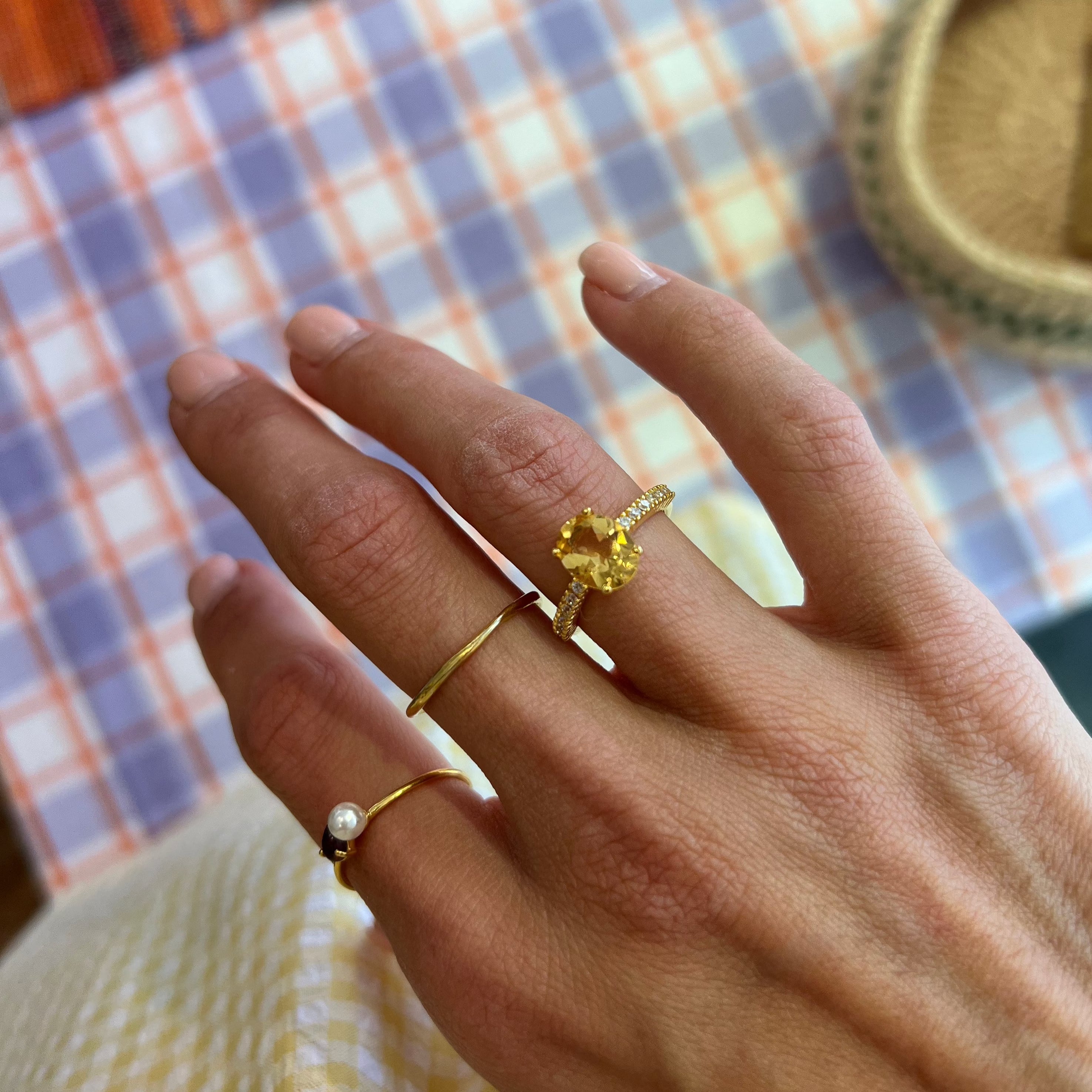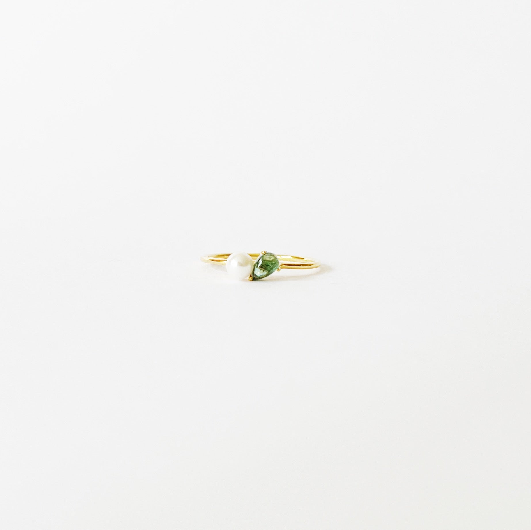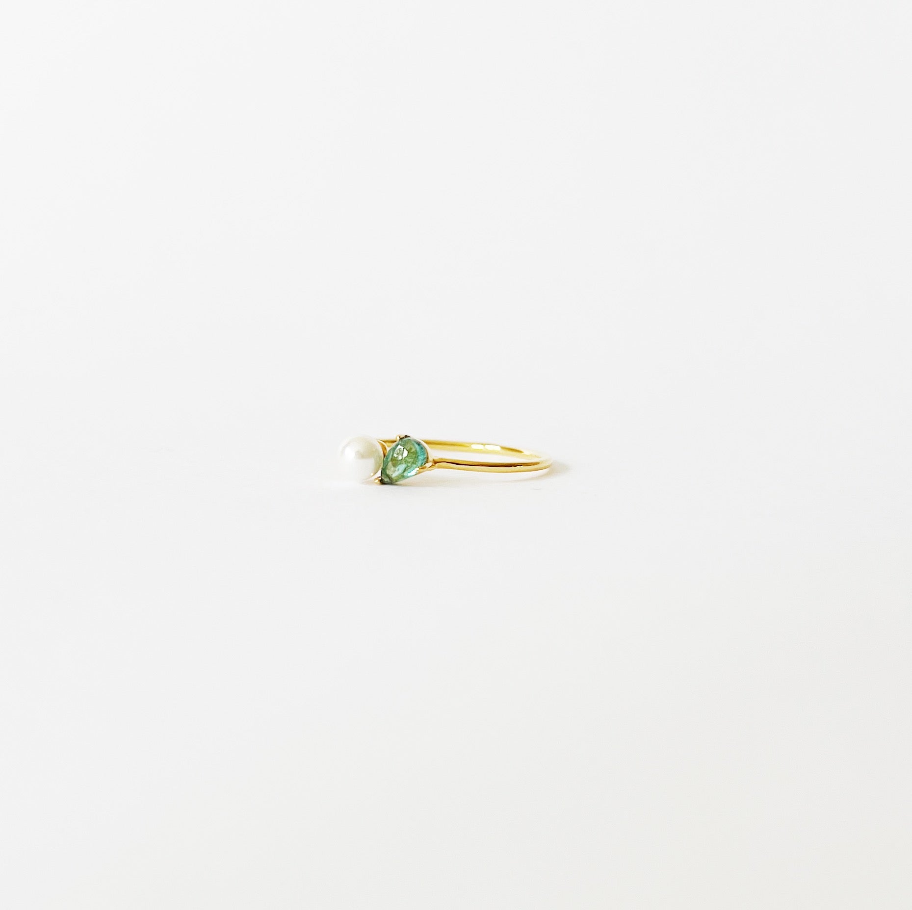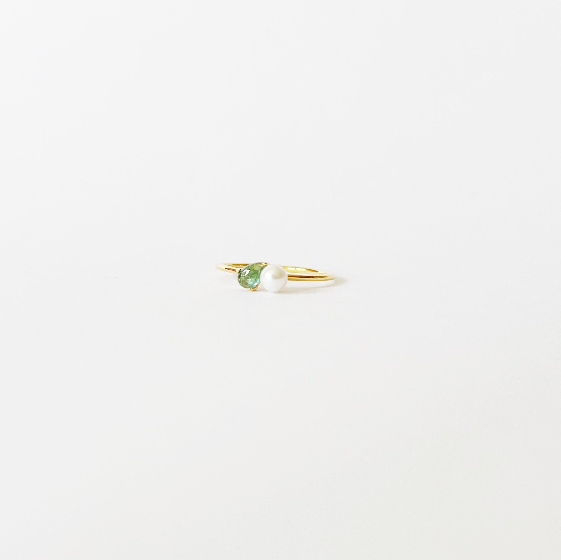 Our bouquet ring is made of a fine ringband with a popping pear shaped gemstone & sophisticated white pearl. It reminded of us of a small little bouquet on your hand, flourishing your day.