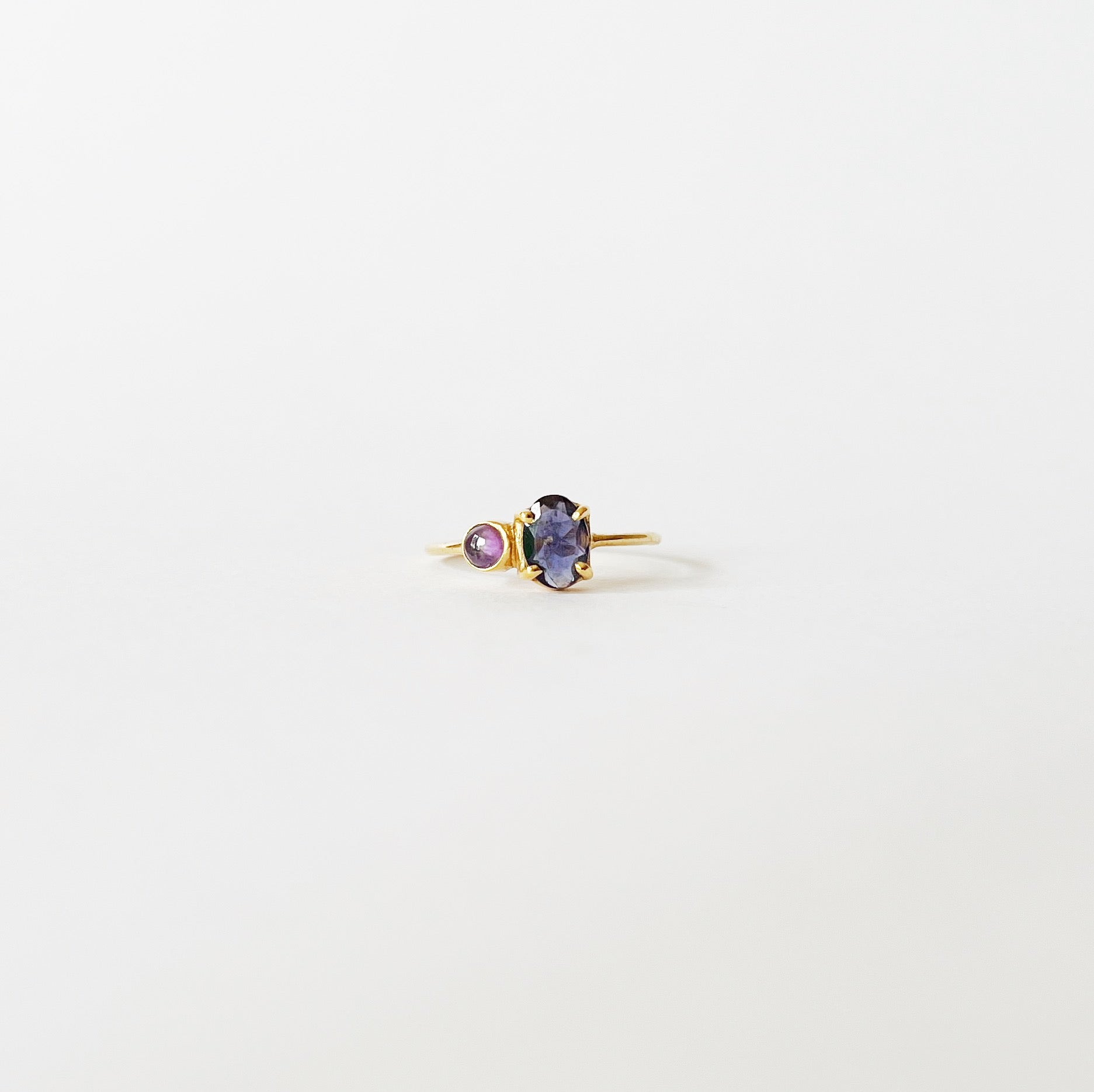 A reinvention of the basics, a timeless oval ring clasped by a prong setting and accompanied by a bezel setting round stone. The essence of this design lays in the colour and form contrast, creating a balanced harmony.