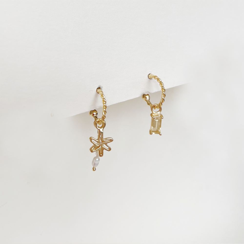 Our charm collection is made for you to mix & match effortlessly. Style your hoops with 1, 2, 3 or even 4 charms, to create the ultimate combination. We've combined this asymmetrical pair ready for you, which consists of: