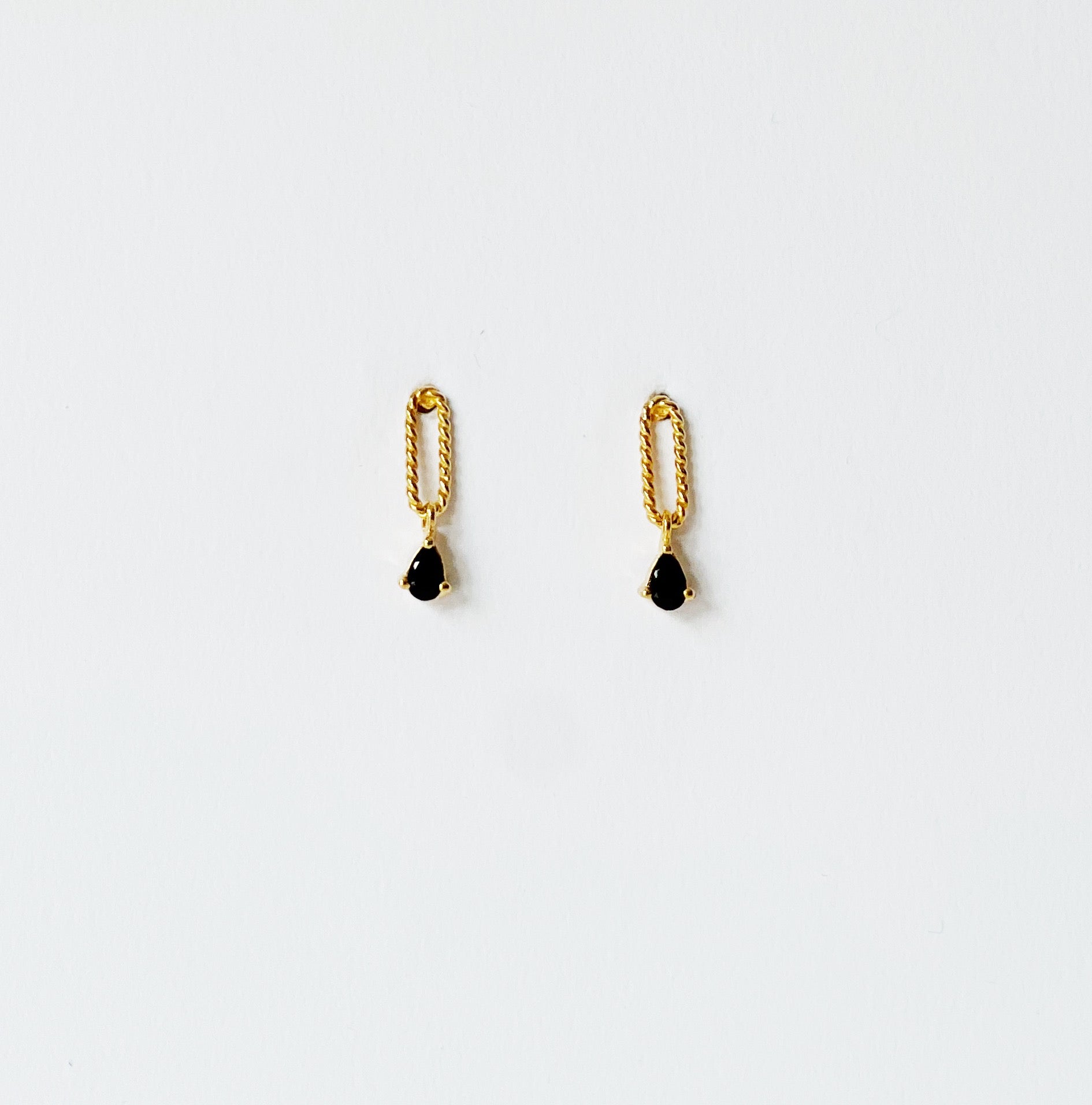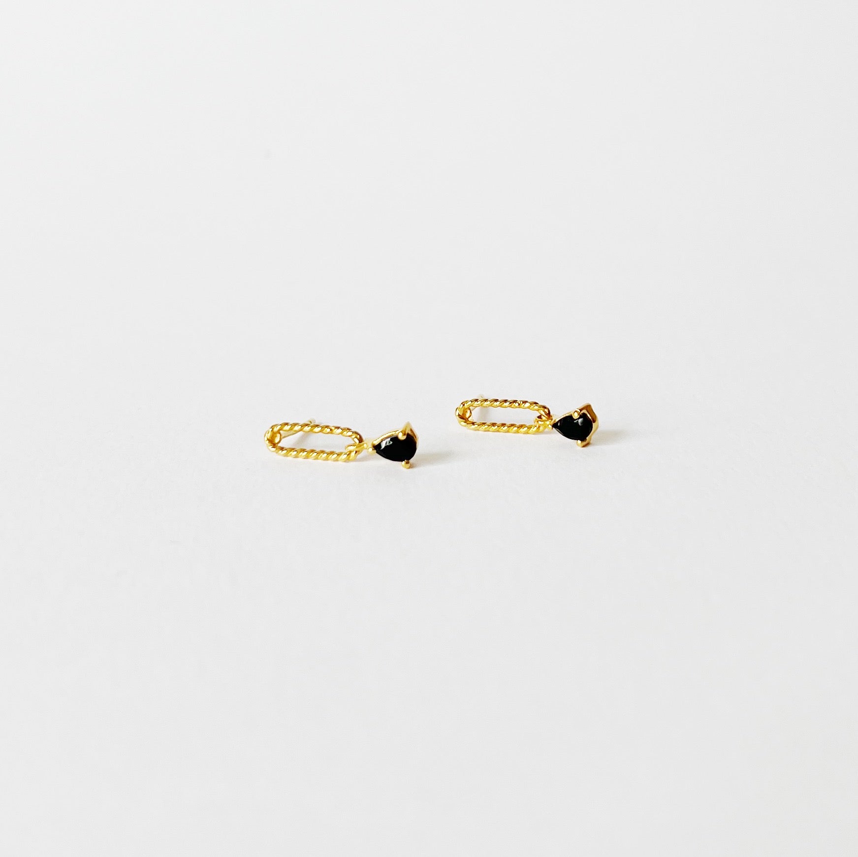 The pixie earrings are the cutest, handmade from a fine twisted band in an oval shape, finished with a dangling teardrop gemstone. Available in multiple colours.