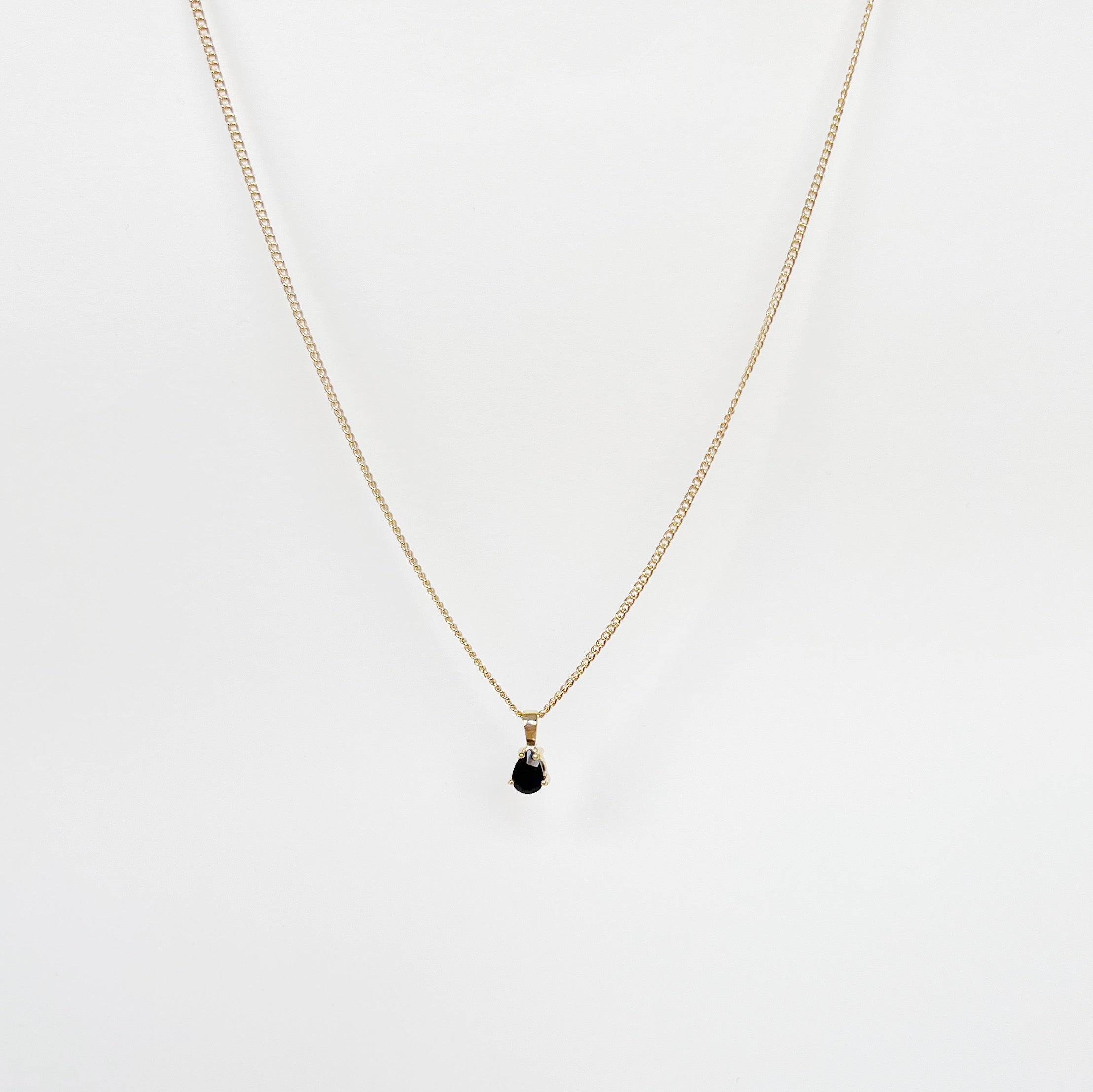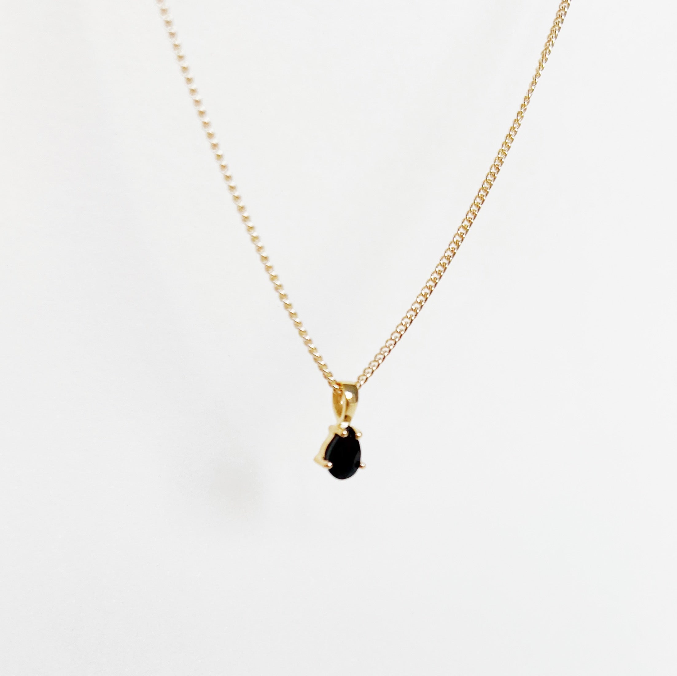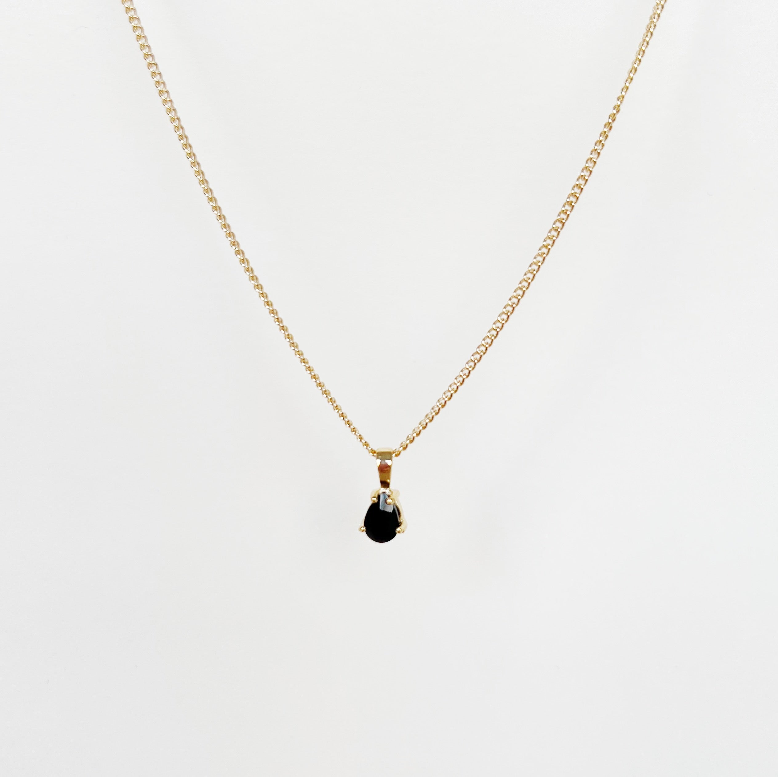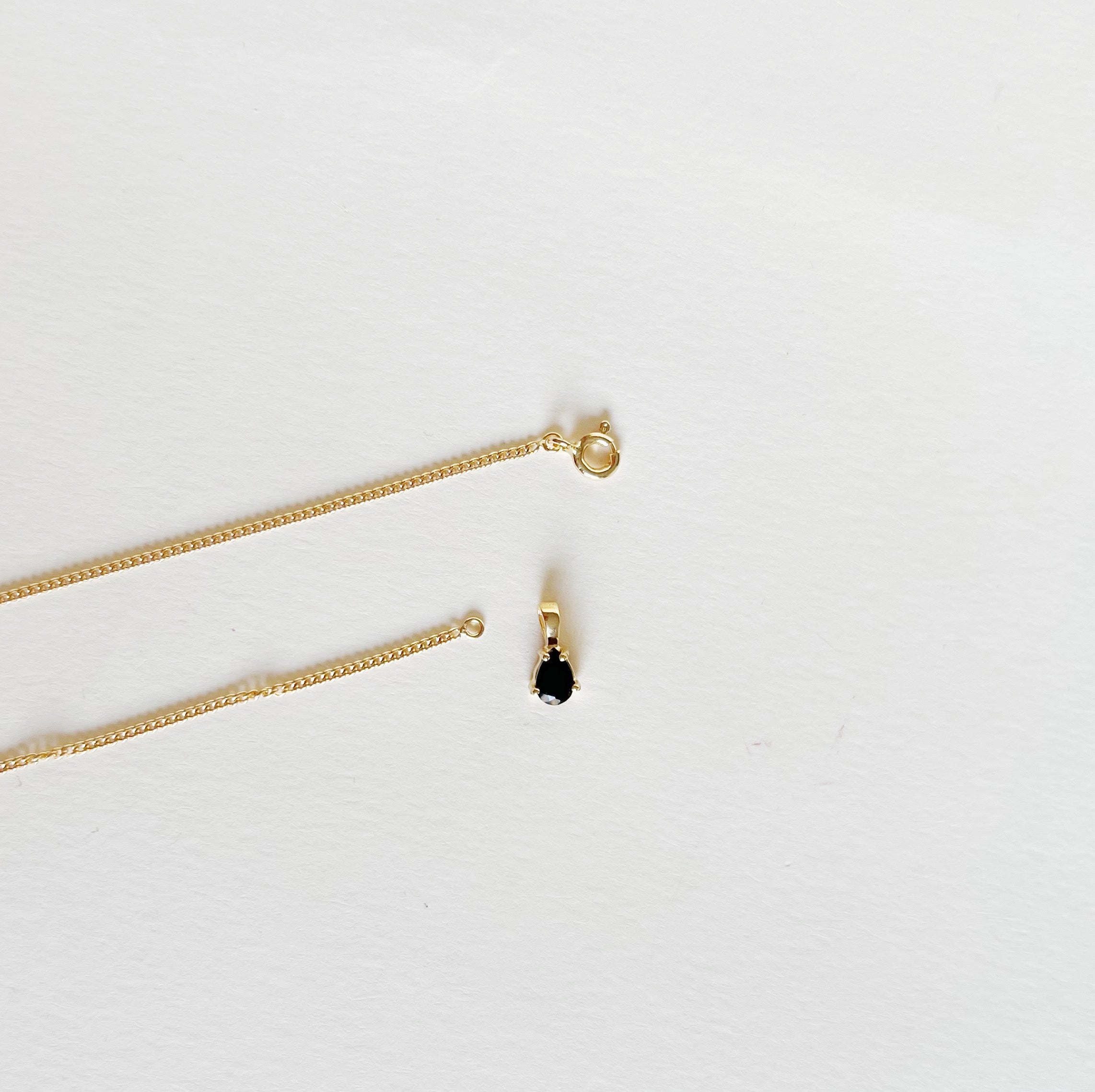 The teardrop necklace consists of a simple curb chain necklace and a teardrop charm in Black Onyx. The closing of the necklace is designed so the charm can easily be removed, so you can play and add other charms to it.