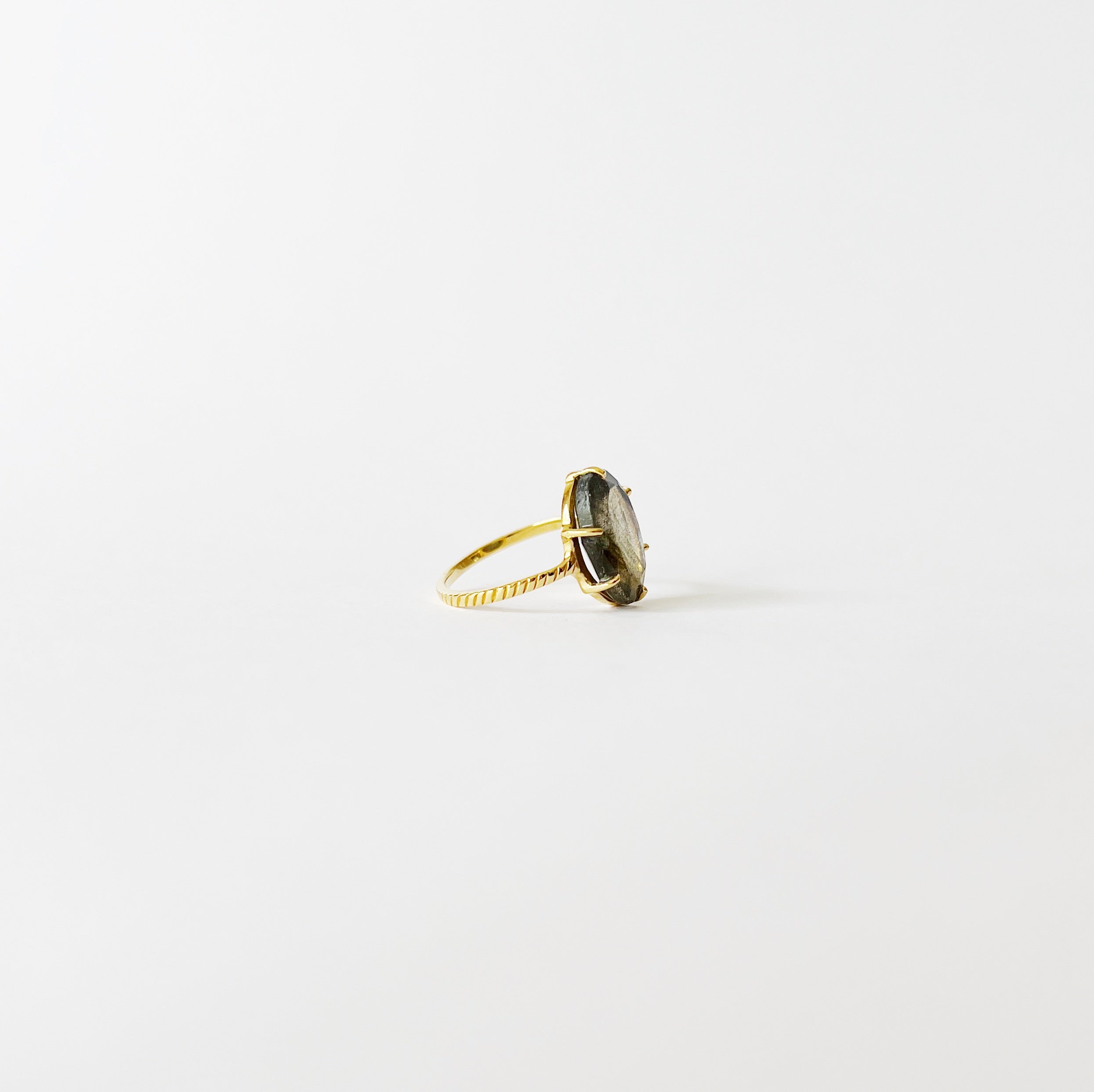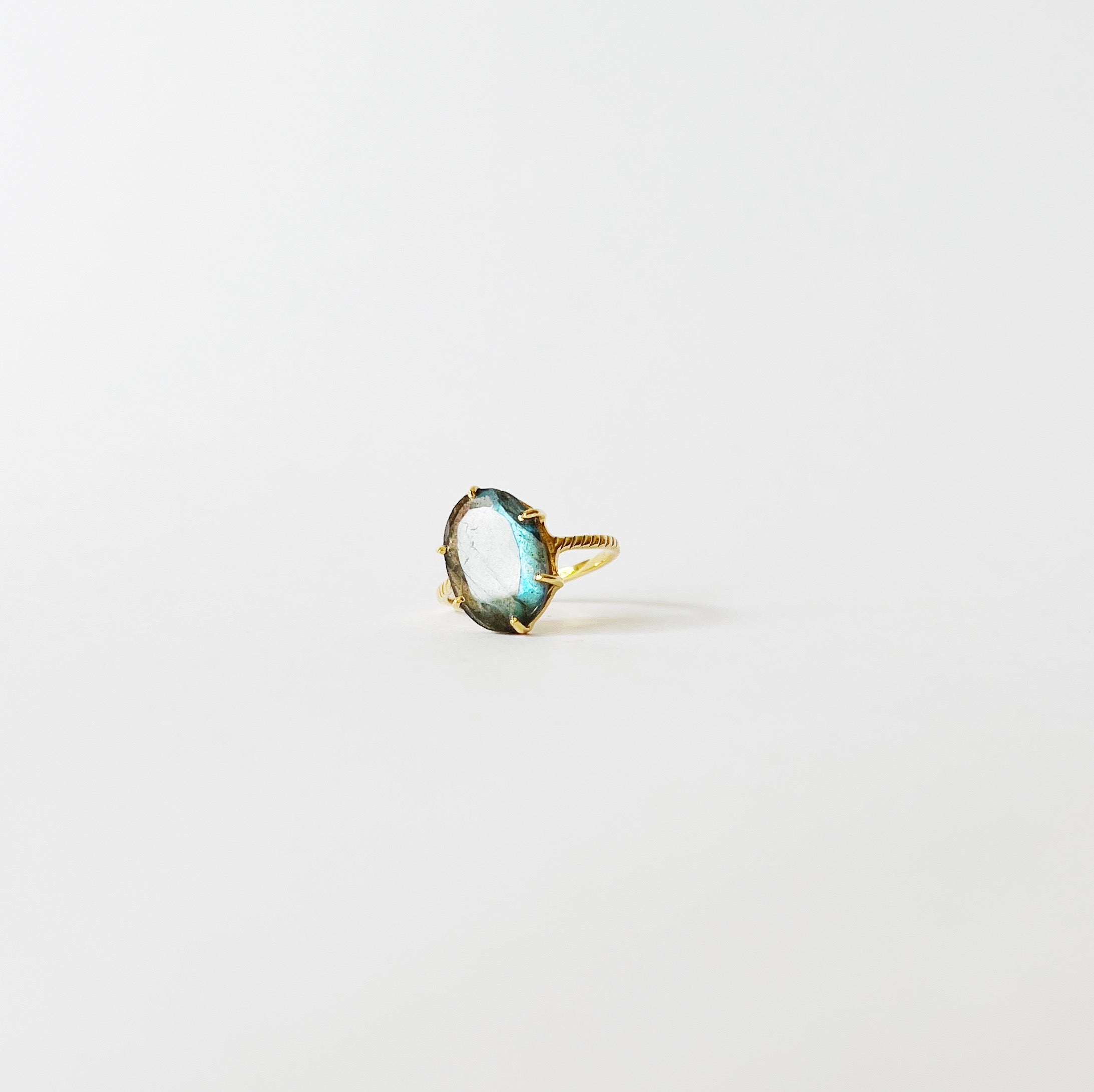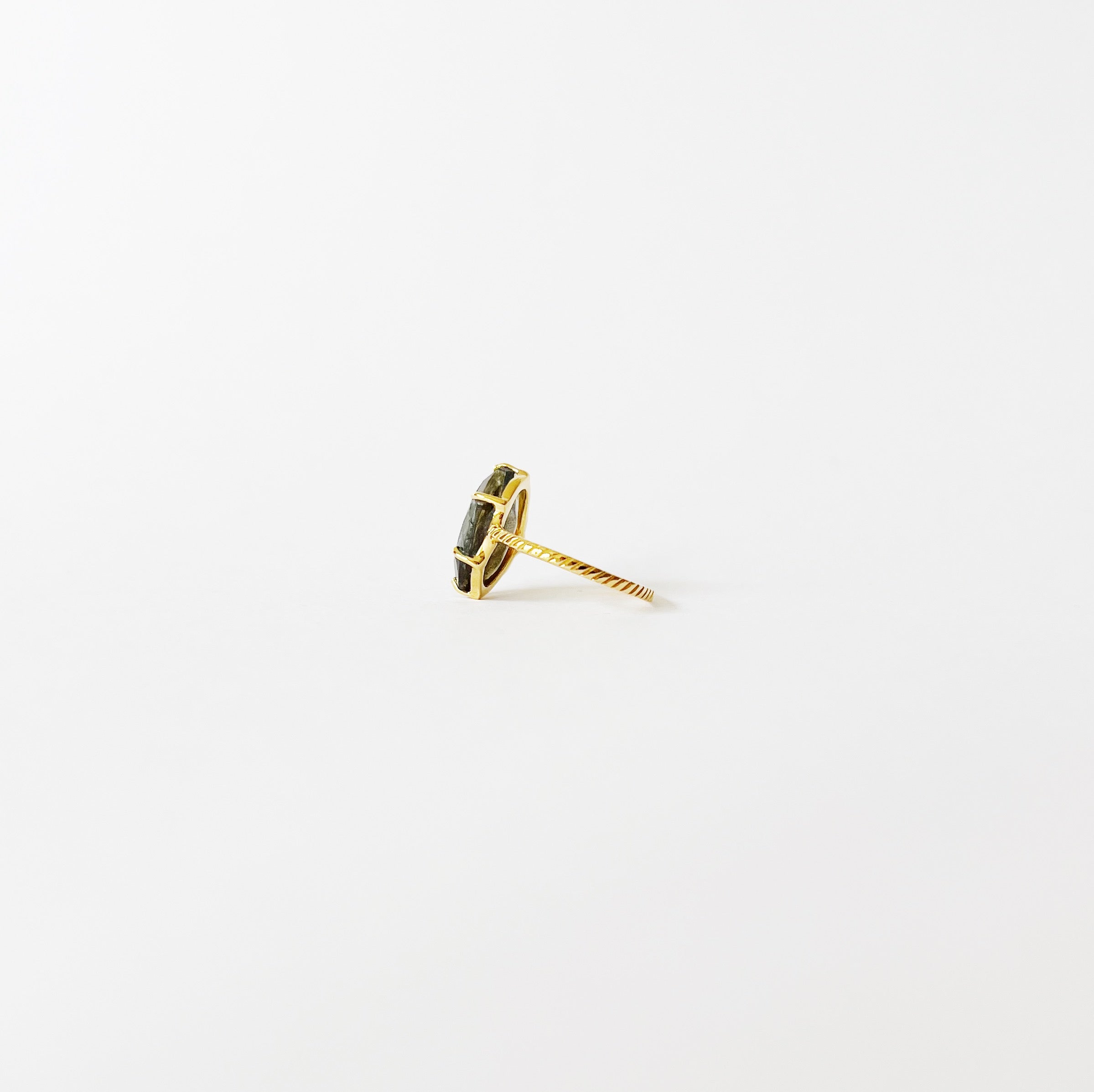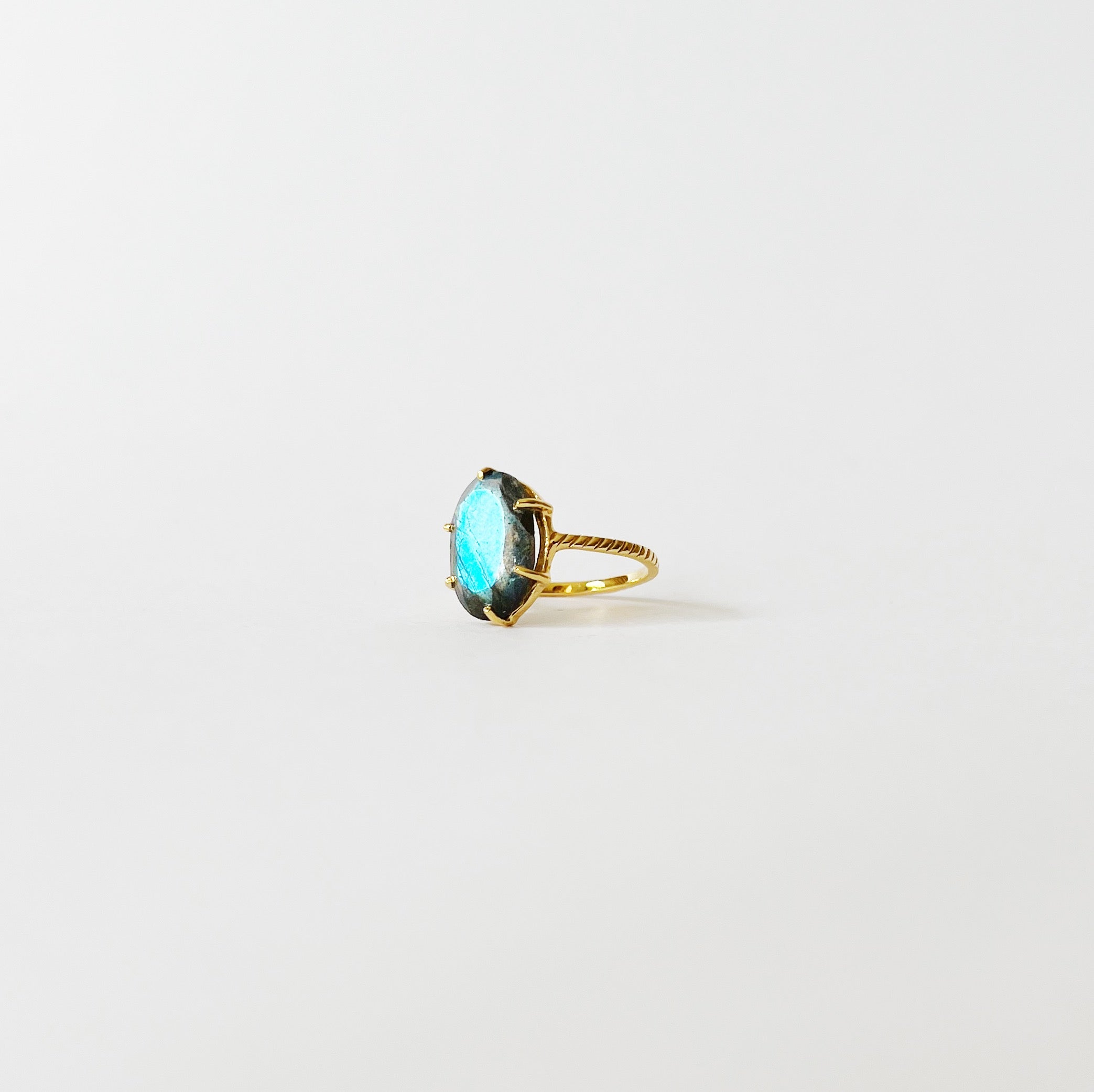 Made from 925 sterling silver, plated with 3.0 micron 18k gold. Topped with an oval shaped gemstone in an interesting variety of blue, grey and green hues. A natural gemstone, which exists in many different variants.