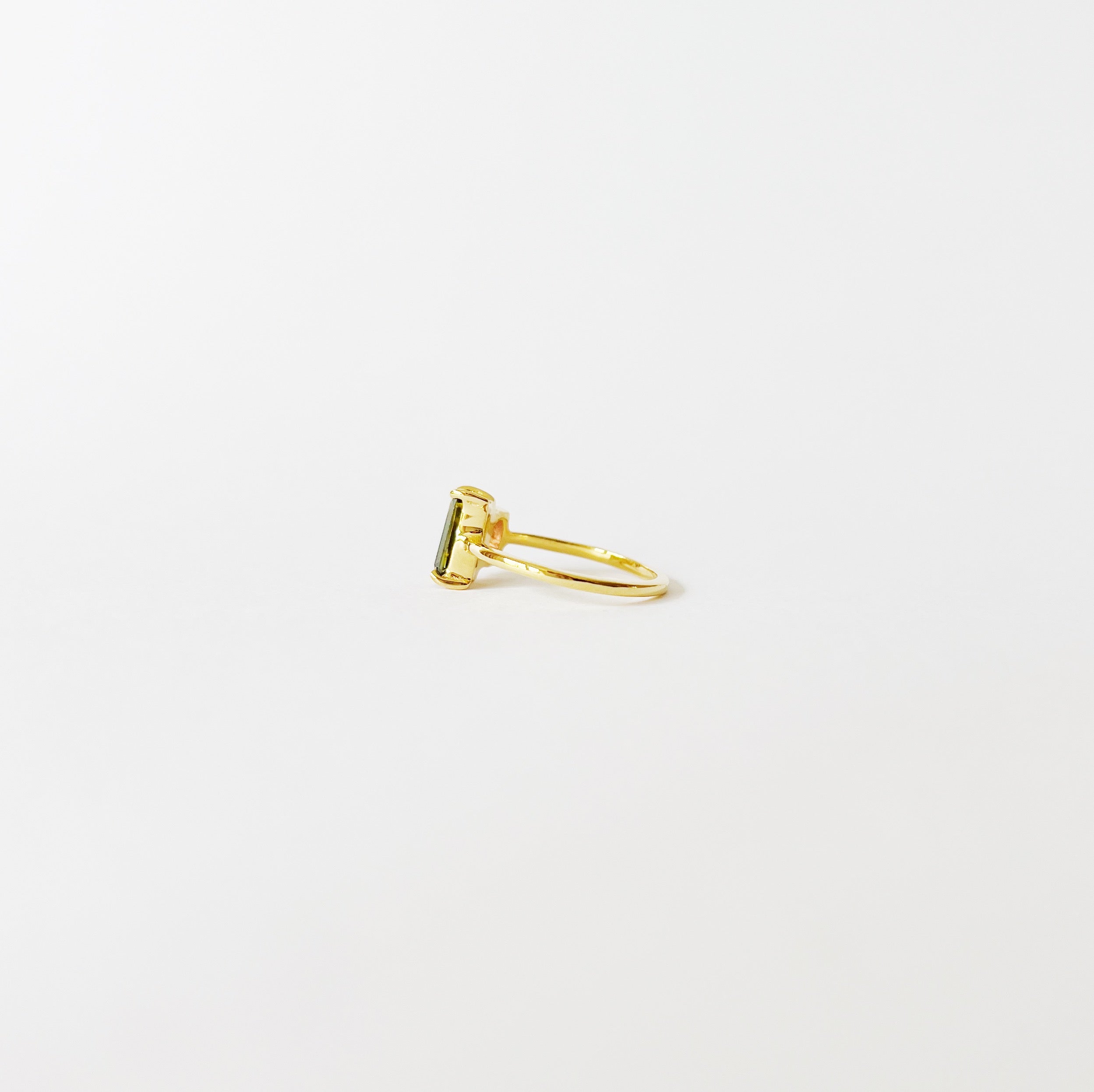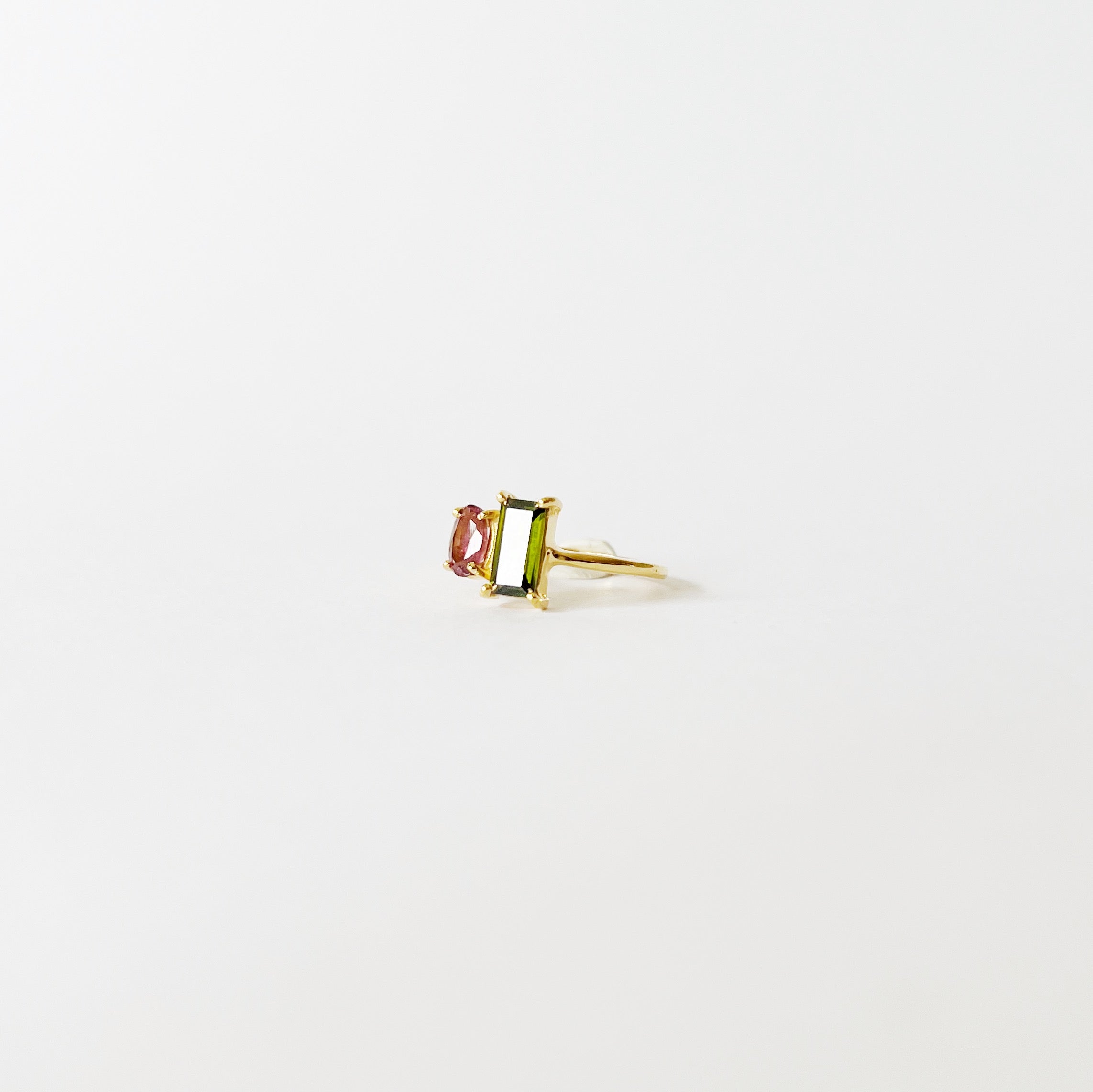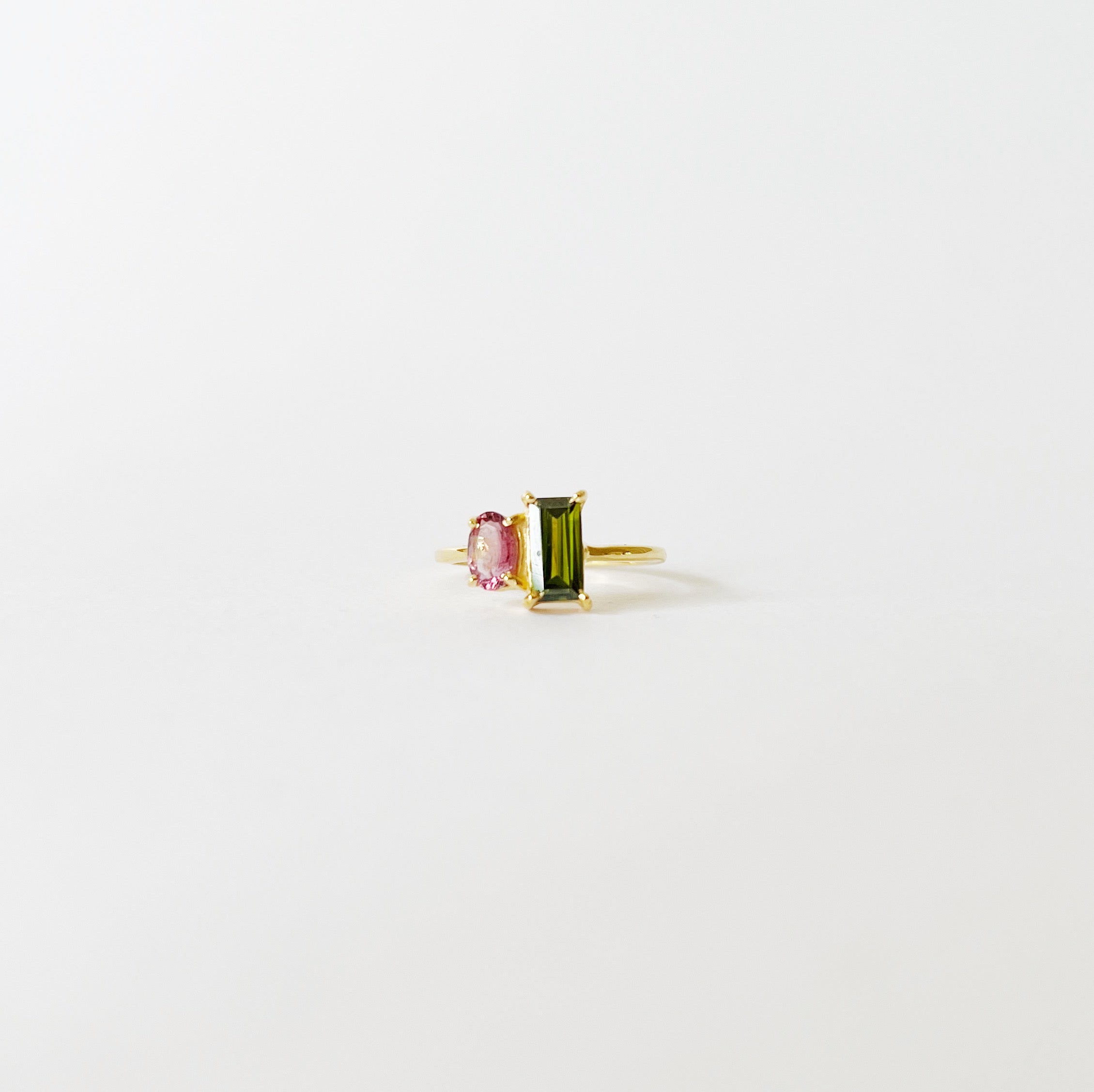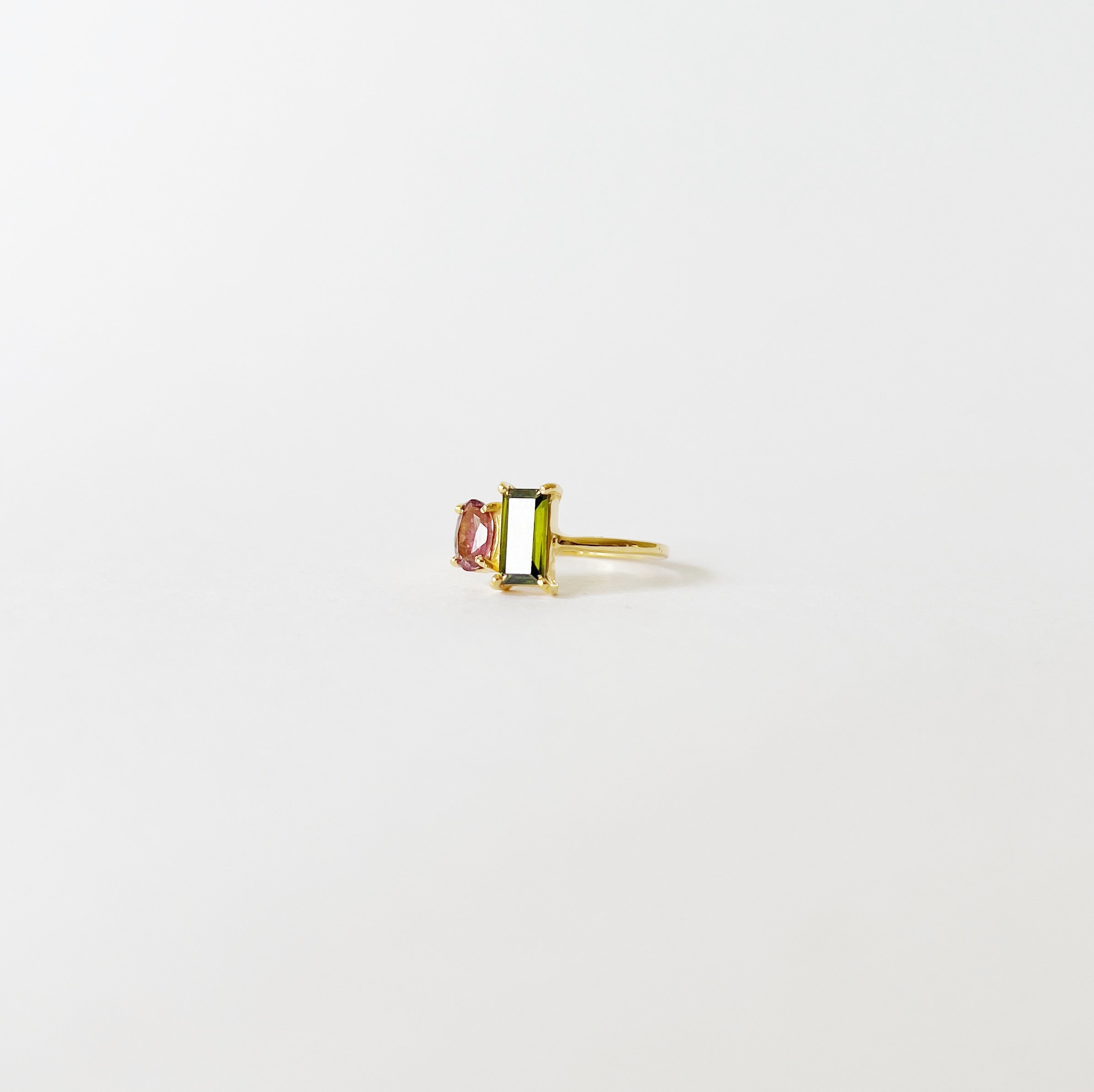 A favourite ❤️ Discover our Goyal ring with steady 18k gold plated ringband, topped with two gemstones. A rectangular olive green zircon and a smaller oval shaped pink tourmaline.