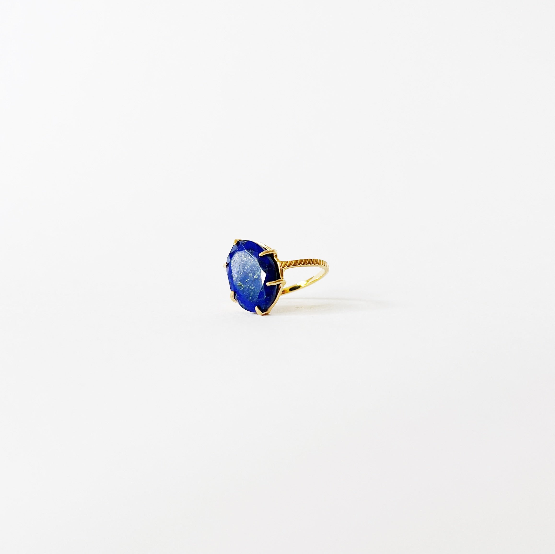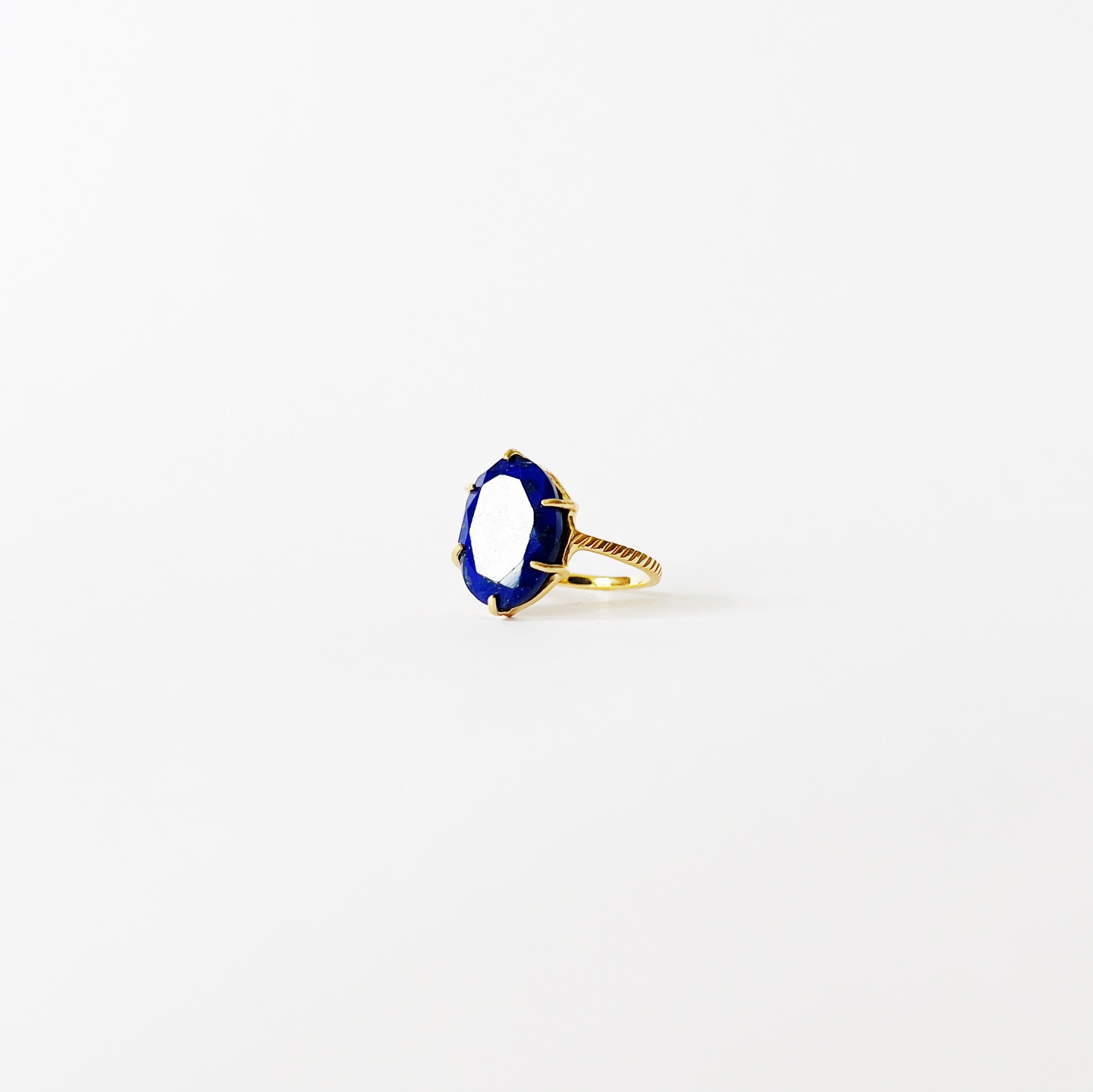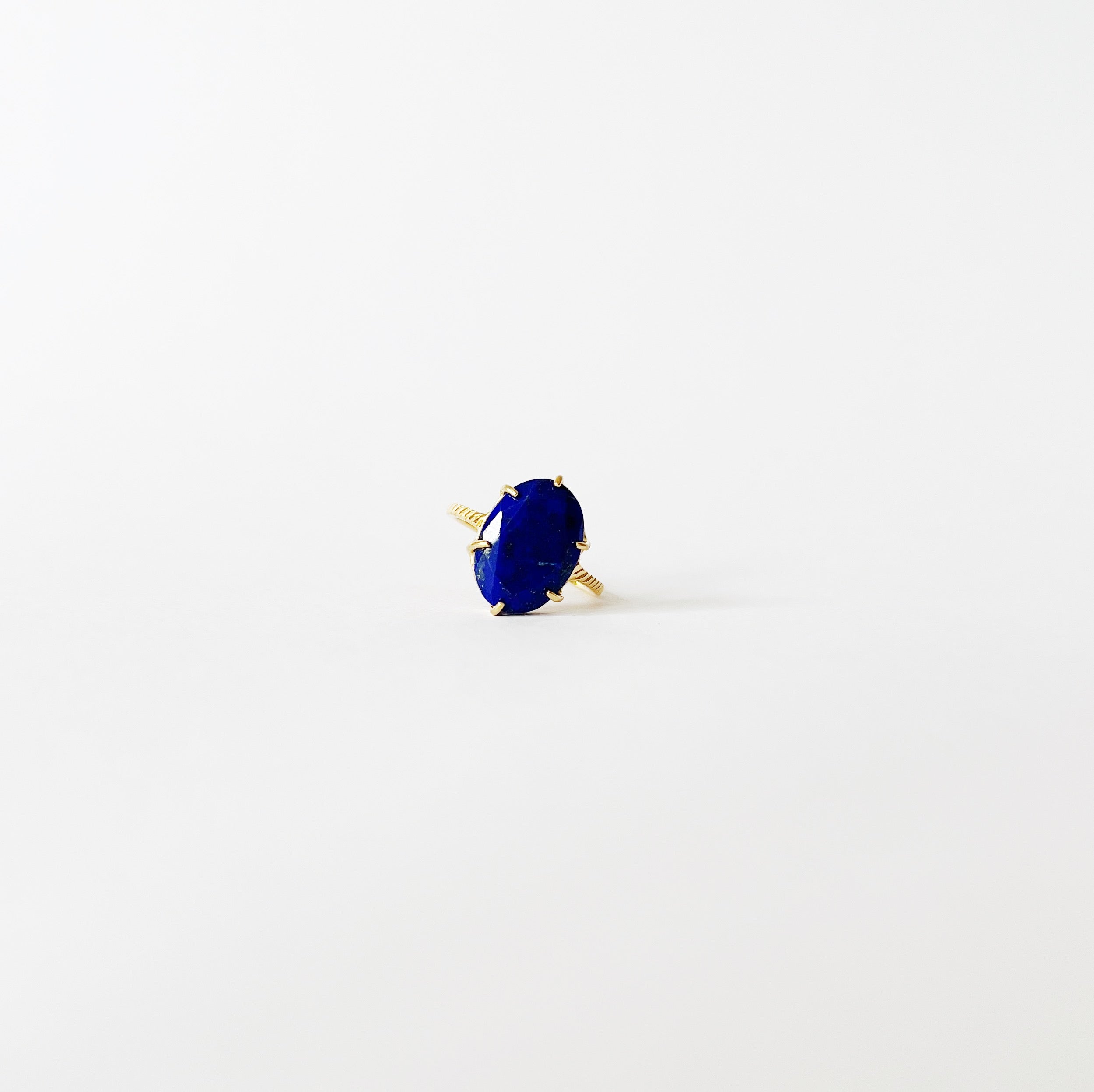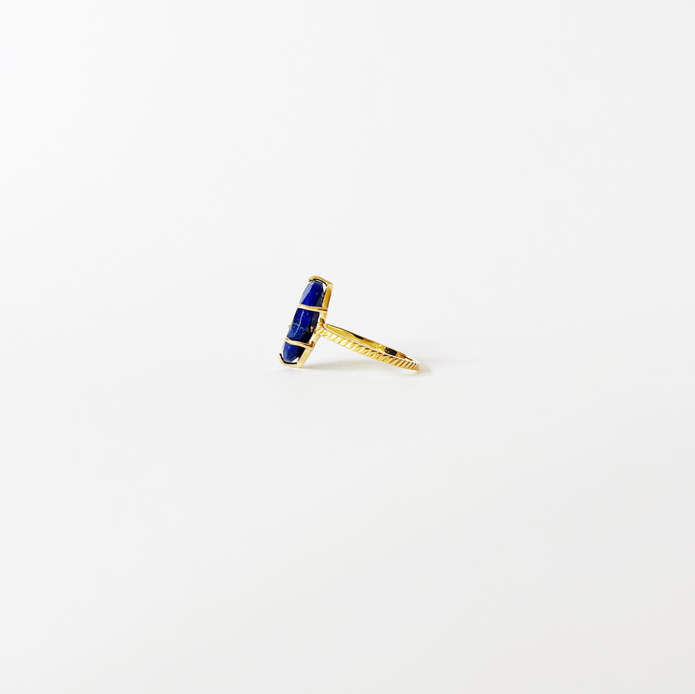 Made from 925 sterling silver, plated with 3.0 micron 18k gold. Topped with an oval shaped gemstone in galactic blue colour, with golden sparkles. Lapis Lazuli is a natural gemstone, which exists in many different variants.