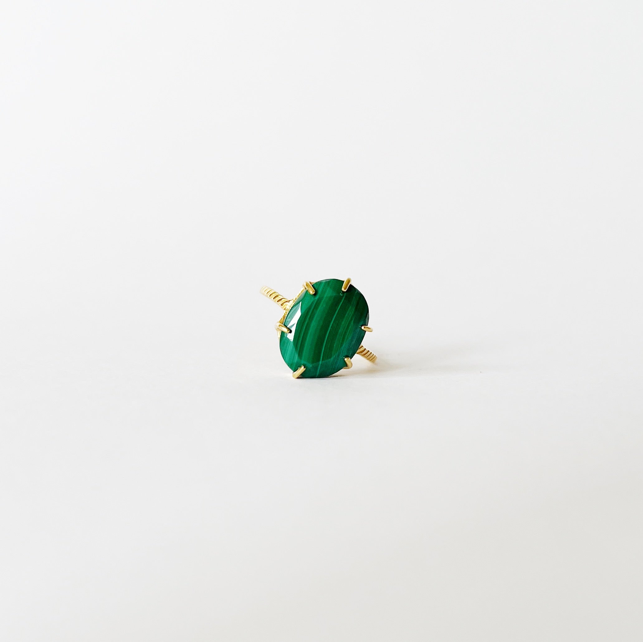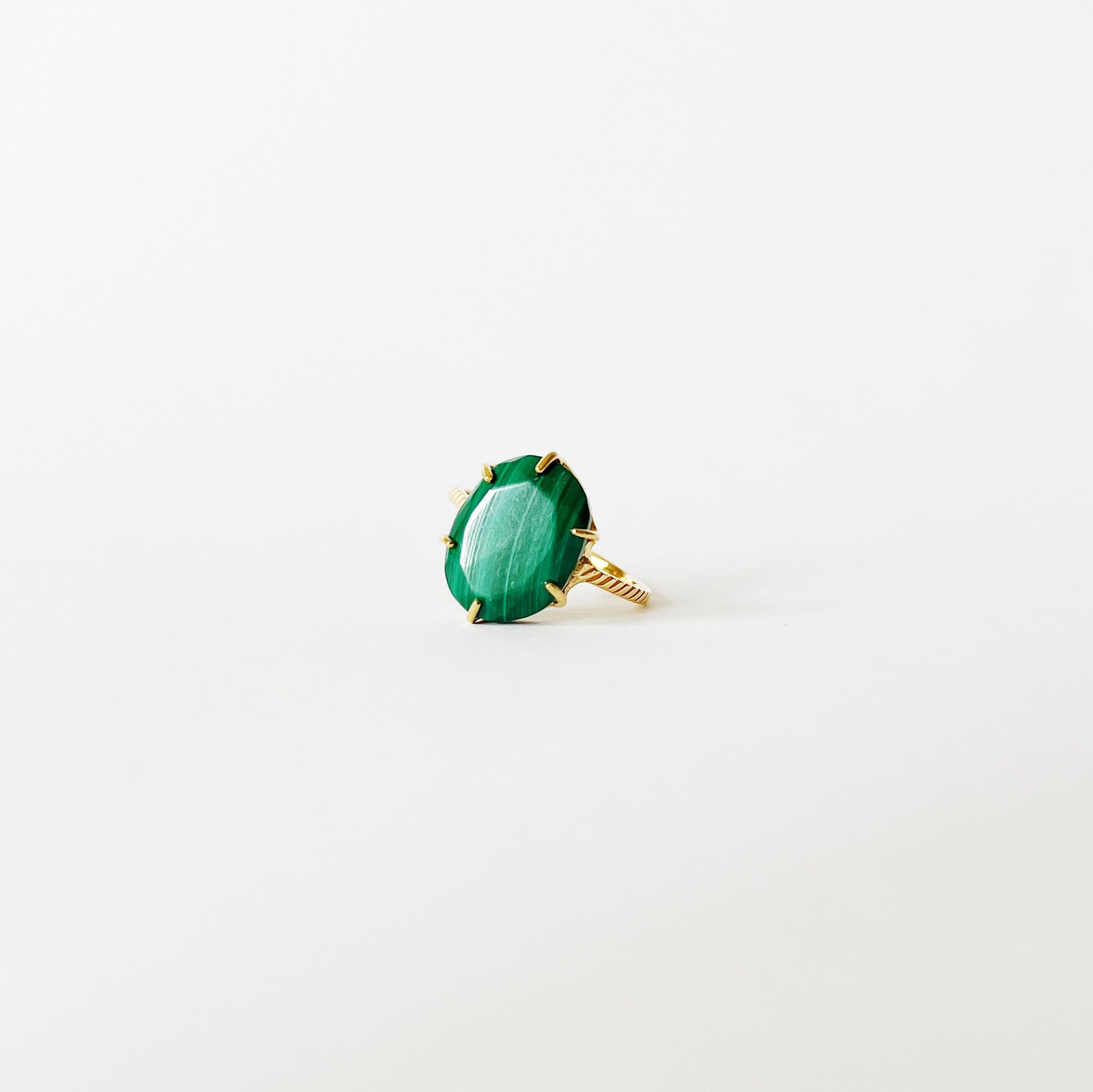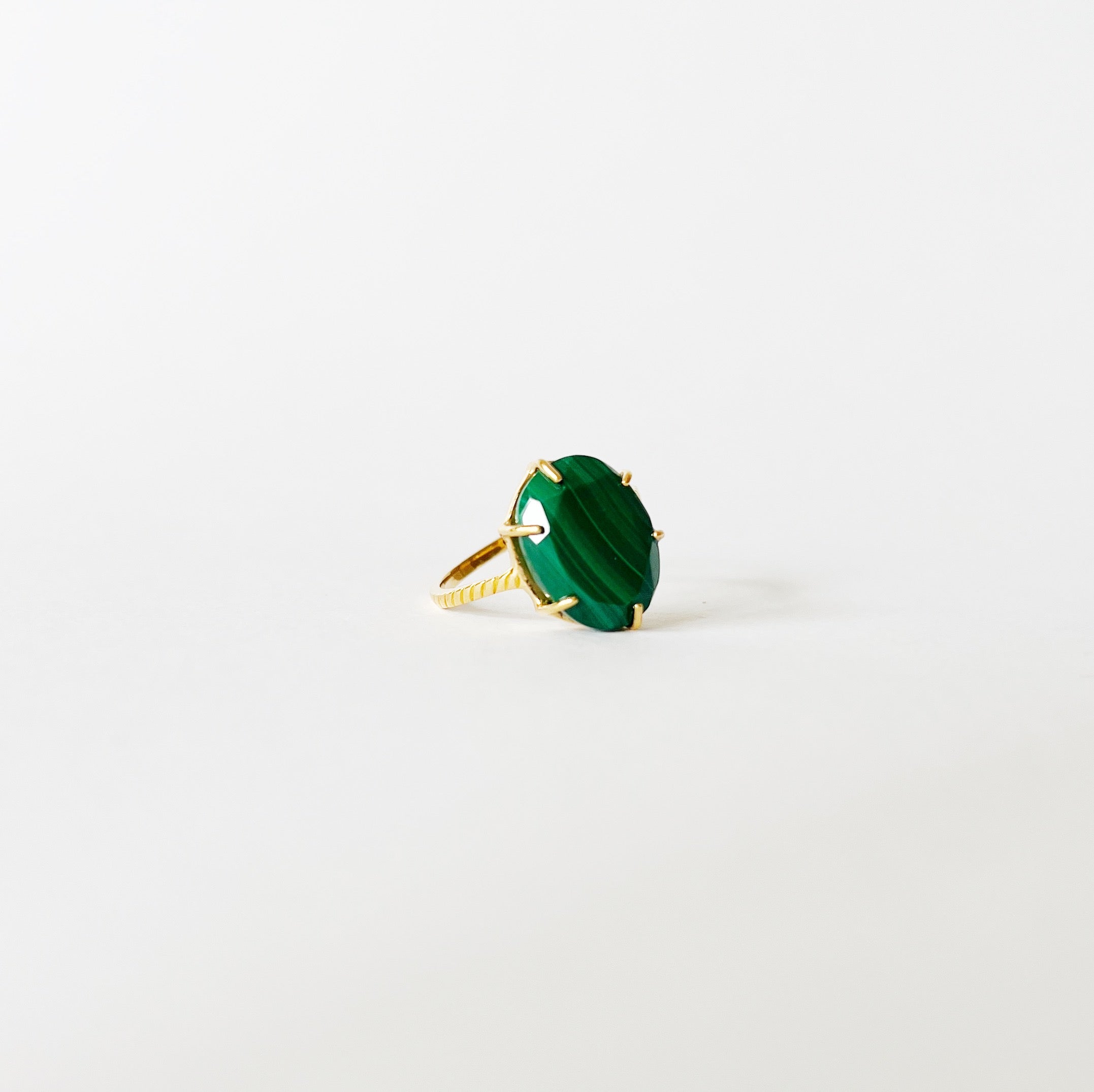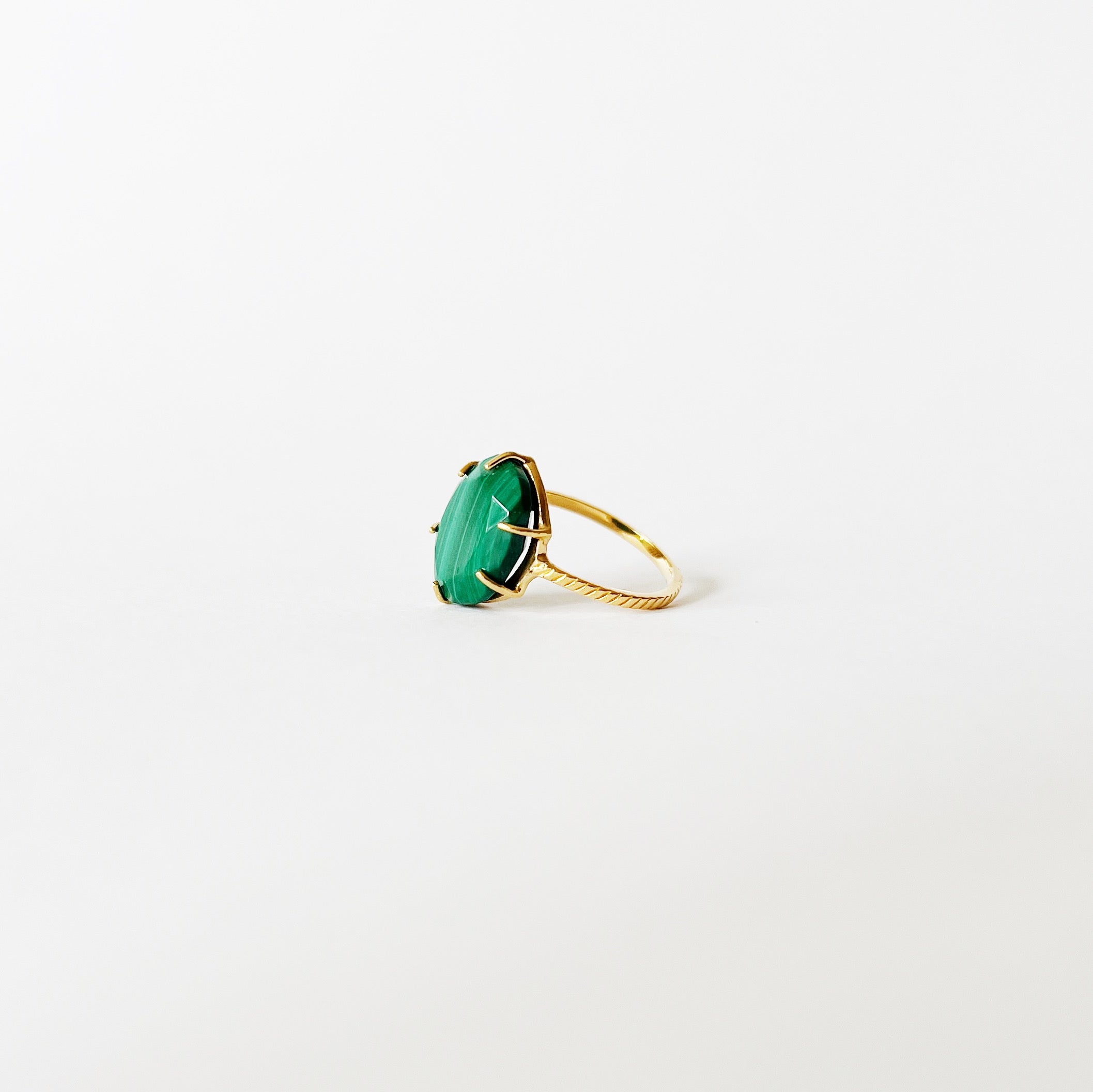 Made from 925 sterling silver, plated with 3.0 micron 18k gold. Topped with an oval shaped gemstone of green Malachite. A natural gemstone, which exists in many different variants.