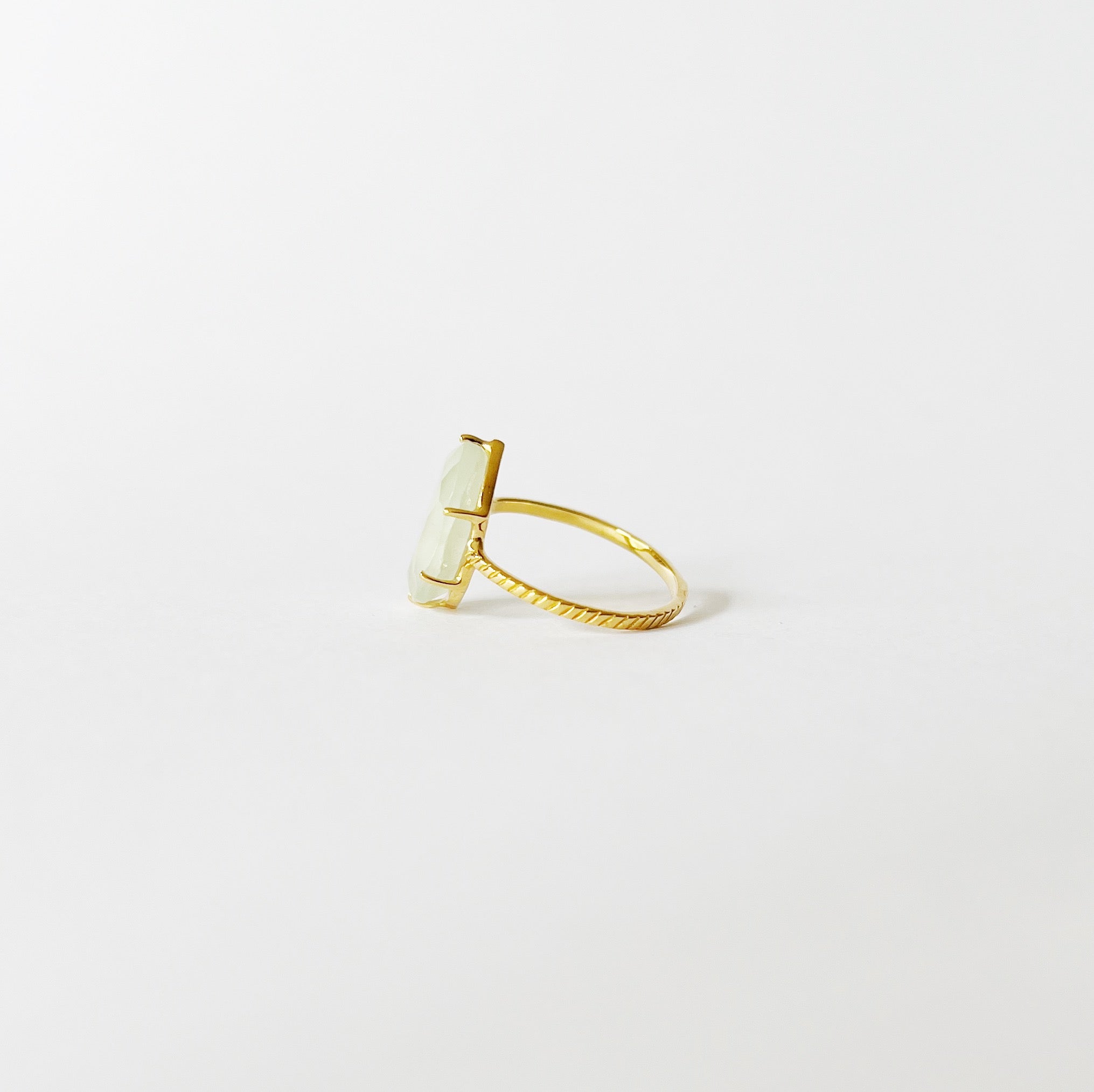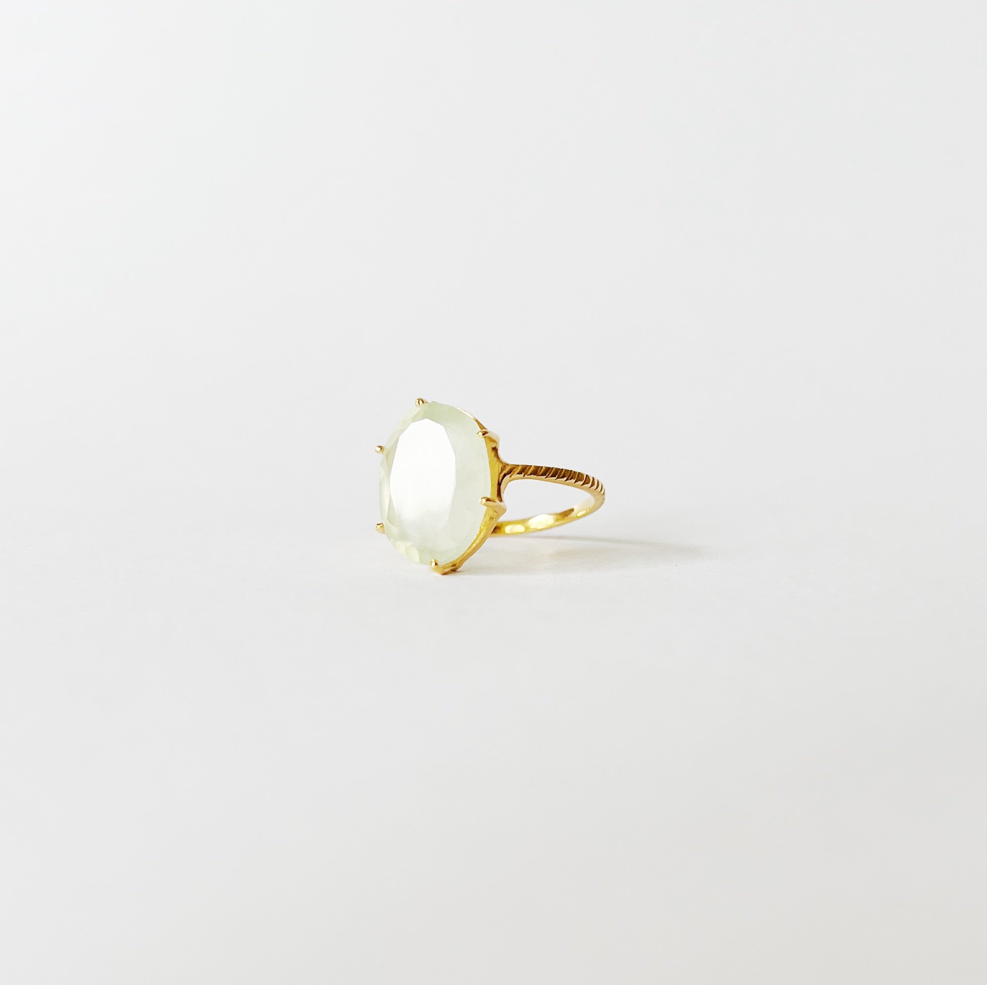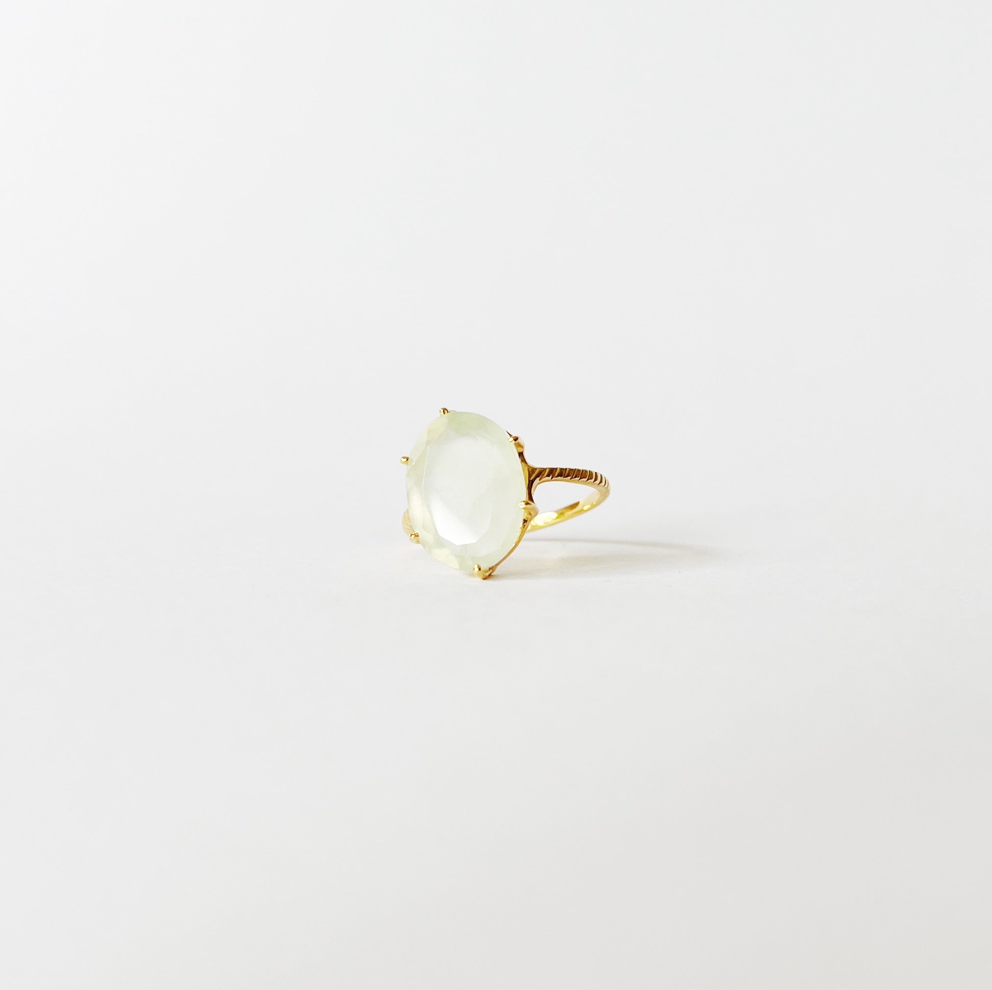 Made from 925 sterling silver, plated with 3.0 micron 18k gold. Topped with an oval shaped gemstone in a light greenish hue. Prehnite is a natural gemstone, which exists in many different variants.
