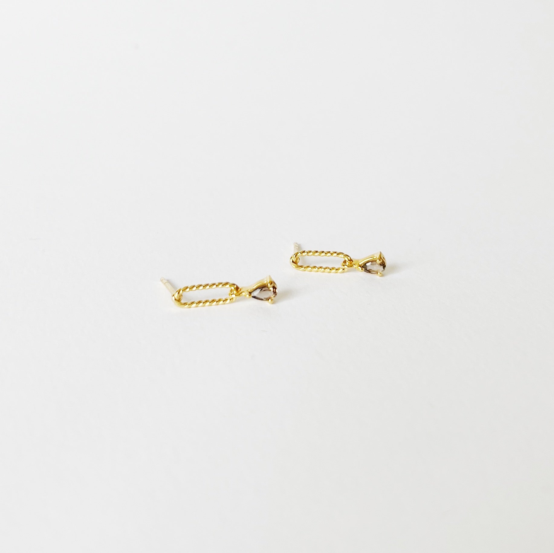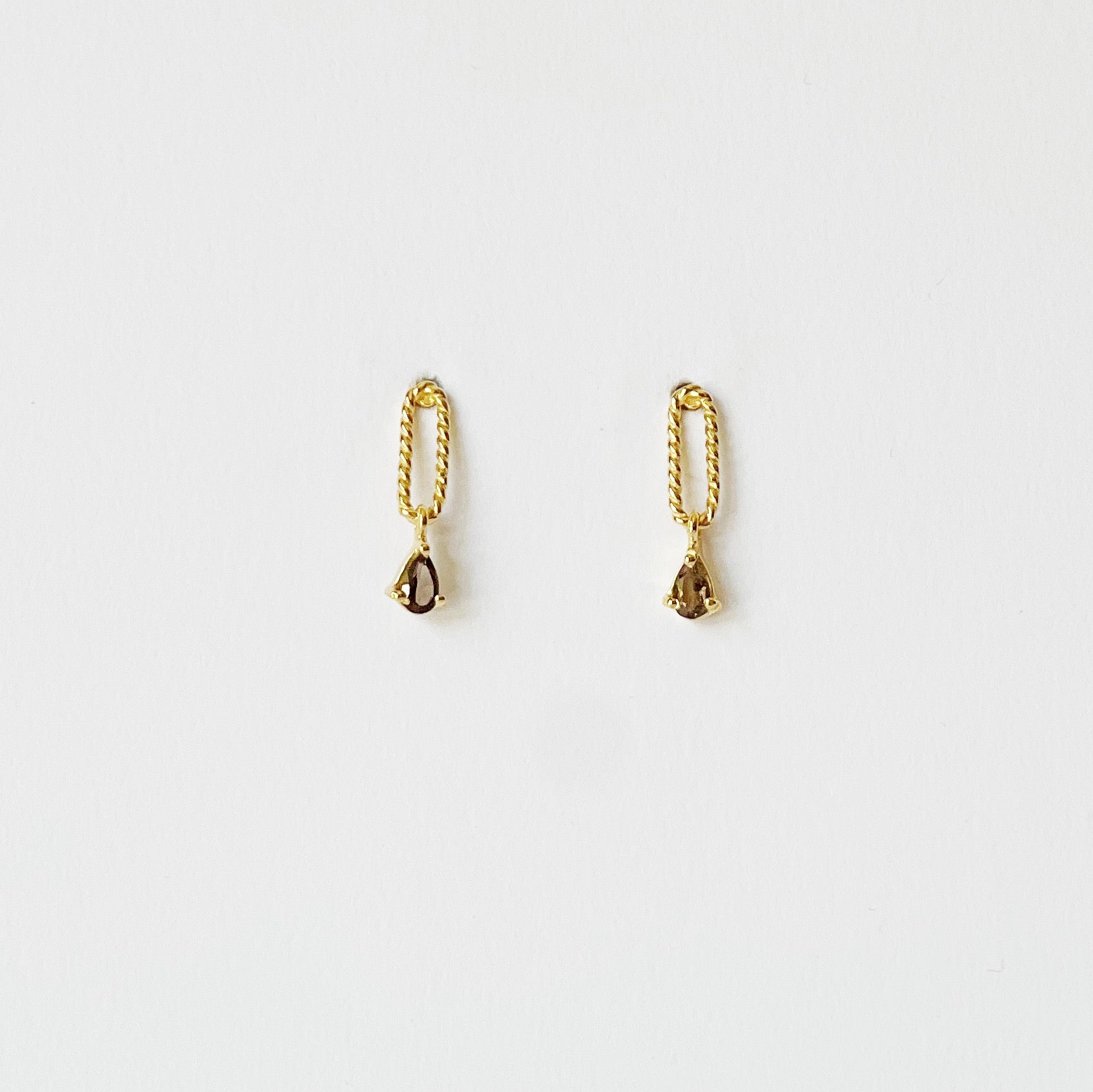 The pixie earrings are the cutest little thing, handmade from a fine twisted band in an oval shape, finished with a dangling teardrop gemstone. Available in multiple colours.